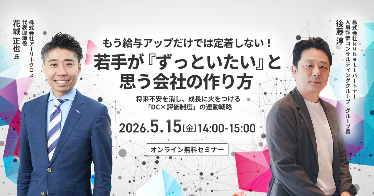 本セミナーでは、アーリークロス代表の花城正也氏が、社員の将来不安を消し、生涯賃金を5,000万円アップさせながら、会社の財務を適正化する「企業型DC」の活用術を公開します。さらに、その安心を「成長意欲」に変えるため、kubellパートナーが「等級とDCを連動させる次世代の評価モデル」を徹底解説。