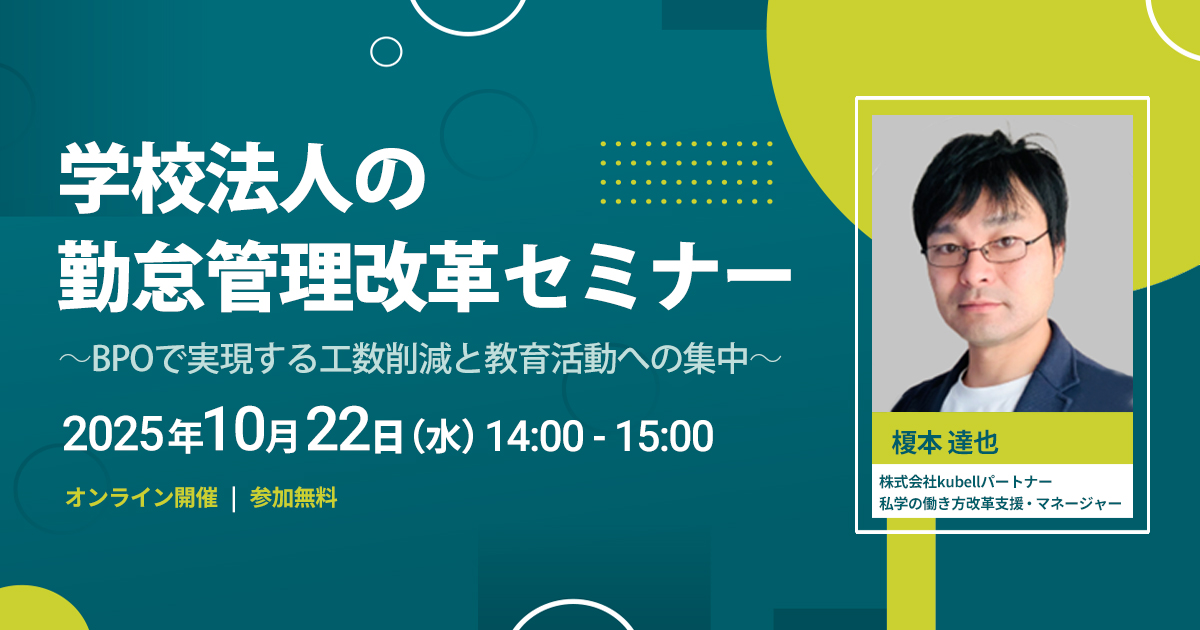 本セミナーでは、学校法人における勤怠管理の課題を整理し、勤怠BPO(業務アウトソーシング)を活用して「業務負担の軽減」と「コンプライアンス強化」を同時に実現する方法を、事例を交えながら具体的にお伝えします。